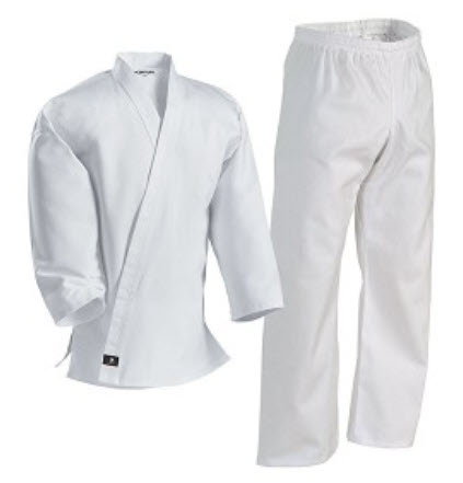 White karate uniform constructed of a lightweight cotton and polyester fabric for easy care. Karate uniform pants feature elastic waist. Sold as a complete martial arts uniform in either Black, White, Red, Blue or Pink. White Belt included with purchase. Fabric weight approximately 6 oz. Ideal for Karate, Taekwondo, Kempo and other martial arts.